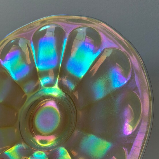 Carnival glass gets its iridescent sheen from the application of metallic salts while the glass is still hot from the pressing. A wide range of colours and colour combinations were produced; scarcely used colours can command very high prices on the collector market.