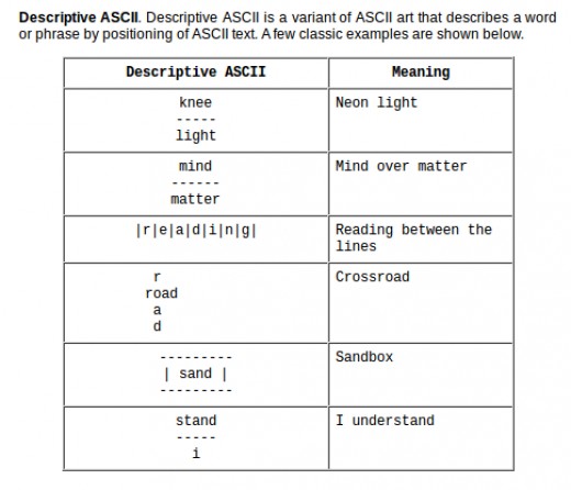 Rebus Puzzles, Wordies, Visual Puns, Pictogram Puzzles and Descriptive ASCII