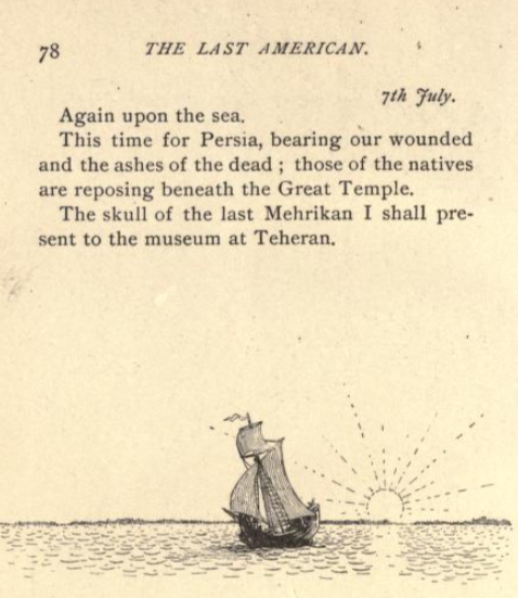 The Last American "Short future history novel from John Ames Mitchell (1845–1918). First published in 1889, it is the fictional journal of Persian admiral Khan-Li, who in the year 2951 rediscovers North America by sailing across the Atlantic."